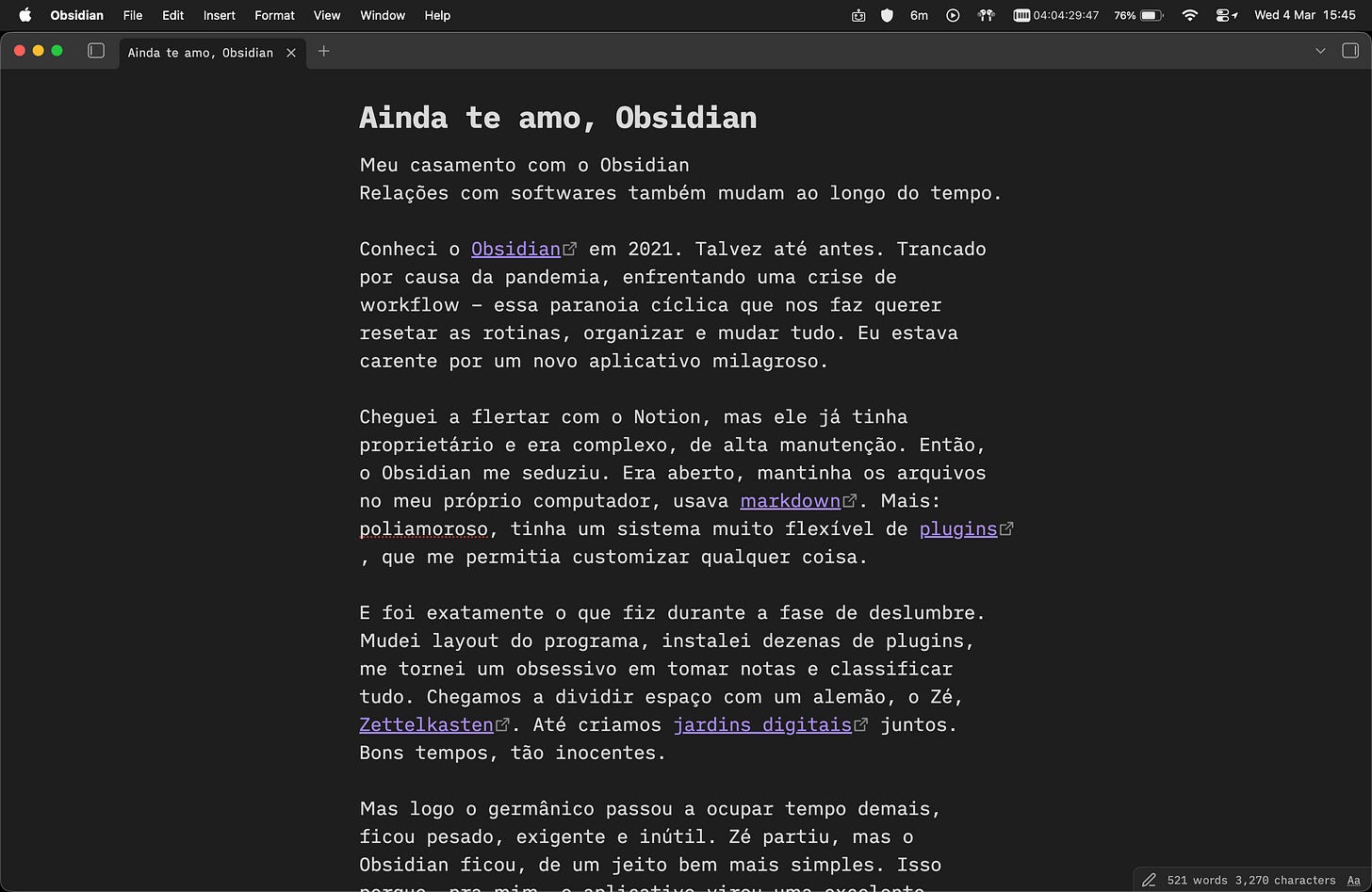 Mas logo o germânico passou a ocupar tempo demais, ficou pesado, exigente e inútil. Zé partiu, mas o Obsidian ficou, de um jeito bem mais simples. Isso porque, pra mim, o aplicativo virou uma excelente máquina de escrever, um lugar calmo onde posso despejar meus obscurecimentos intelectuais.